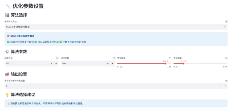系统使用的是多目标优化算法(如NSGA-II),可在不人为设定权重的情况下,同时优化多个目标,并探索大量方案。