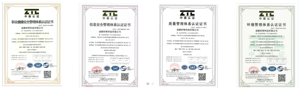 MatAi(材智科技)是专注于AI+研发数字化技术应用的国家高新技术企业,荣获“专精特新”企业称号。MatAi作为技术先锋深耕于AI与交叉学科领域,凭借卓越的AI能力和深厚的研发经验重塑传统研发范式,打造出具备前瞻性的数字化研发平台帮助客户加速研发进程,降低研发成本,使复杂的研发过程更加智能化和高效化。公司先后通过了ISO9001 质量管理体系、ISO14001 环境管理体系、ISO45001 职业健康管理体系、ISO20000 信息技术服务管理体系及ISO27001信息安全管理体系认证。