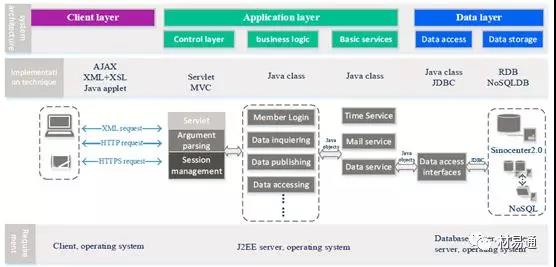 图2:MLCA数据平台的架构及核心技术:MLCA数据平台采用三层结构:客户端层、应用层和数据层。在基于组件的软件开发的基础上,开发了具有可定制性、可扩展性和可维护性的MLCA平台。
