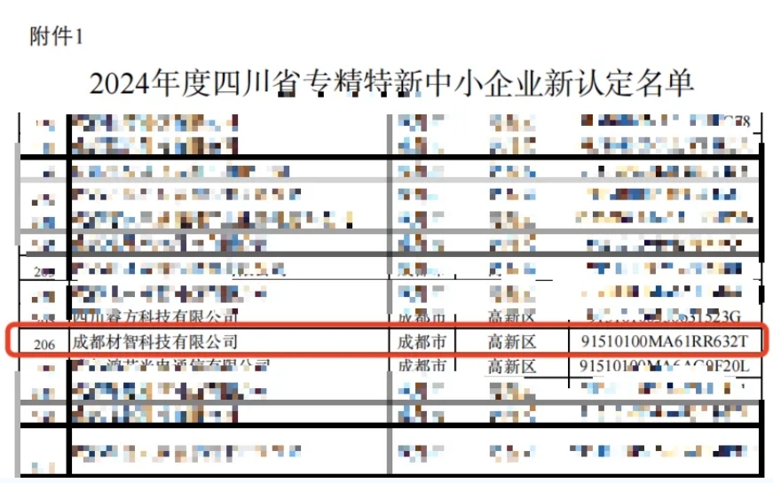 近日,四川省经济和信息化厅正式公布了2024年度四川省专精特新中小企业名单,MatAi(材智科技)凭借卓越的AI能力、深厚的研发经验和专业的数字化技术实力与竞争优势,被认定为省级专精特新企业,这是业界对我们持续、稳健增长的认可。
