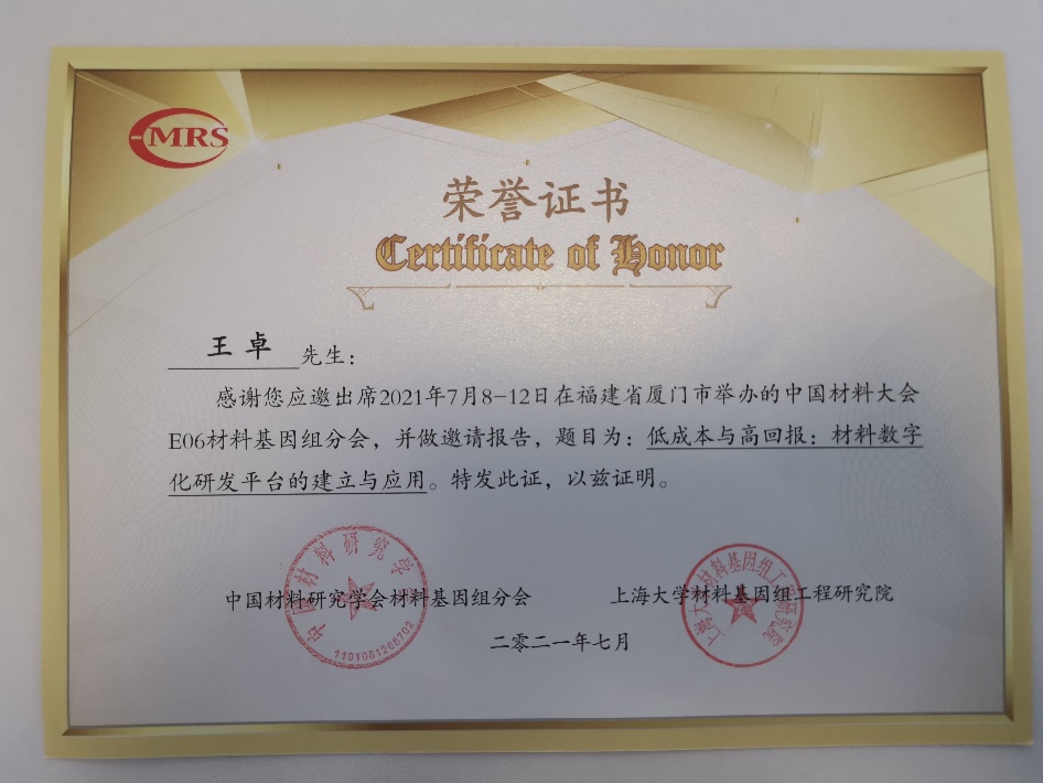 7月9日,2021中国材料大会在厦门召开,MatAi受邀参会,并于材料基因组分会做出邀请报告。